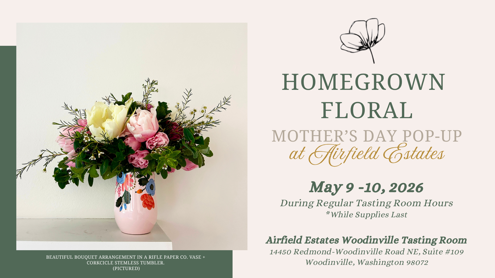 Join us at our Woodinville Tasting Room this Mother’s Day weekend as Homegrown Floral pops up with a beautiful selection of fresh, seasonal arrangements available for purchase. Thoughtfully designed and ready to gift, these florals are the perfect way to celebrate the women who mean the most.